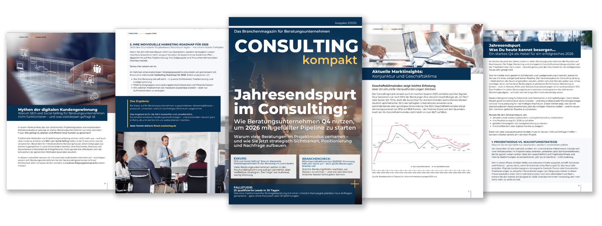 Die aktuelle Ausgabe zeigt, warum der Jahresendspurt 2025 entscheidend für den Erfolg 2026 ist – und wie Beratungsunternehmen sich mit digitaler Sichtbarkeit, klarer Positionierung und gezieltem Performance-Marketing jetzt einen Vorsprung sichern.